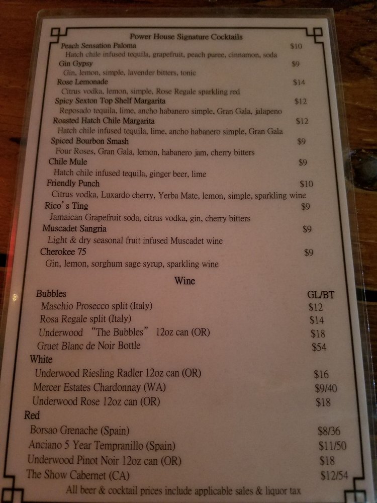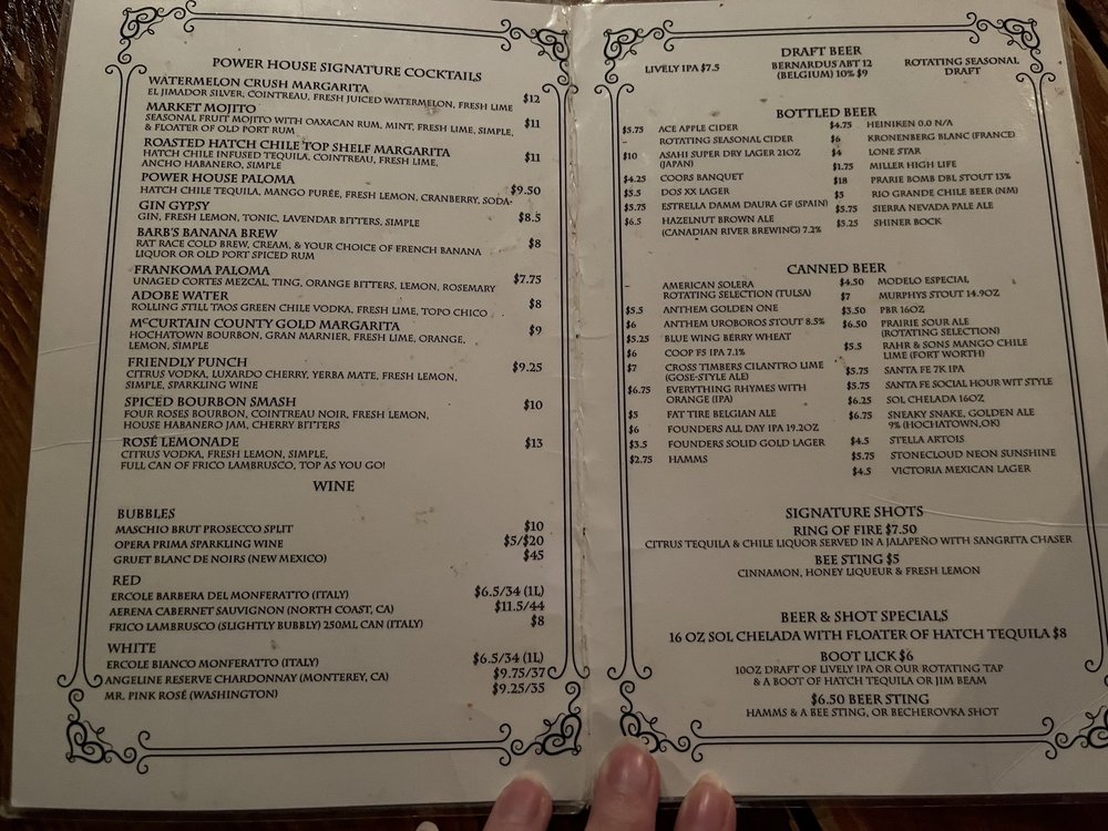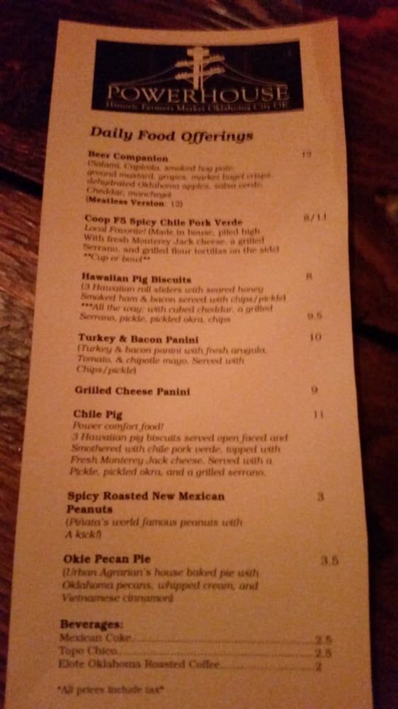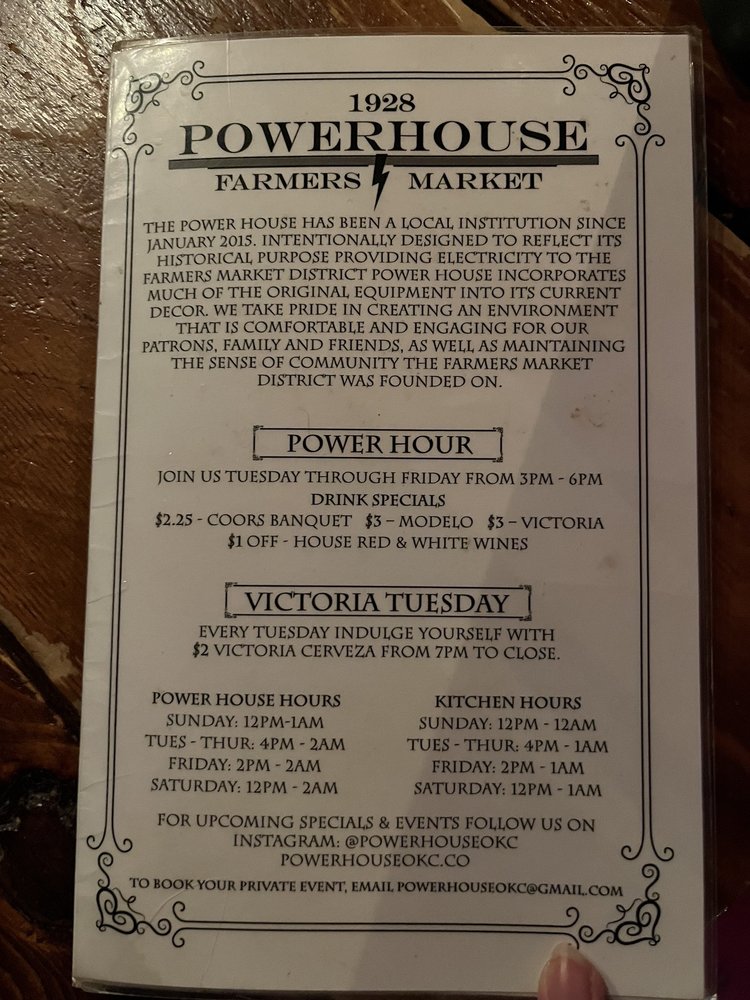 Power House is a vibrant establishment located at 1228 SW 2nd St in Oklahoma City, offering a range of mouthwatering dishes like Spicy Chile Pork Verde, Grilled Cheese Panini, and Hawaiian Pig Biscuits with house-made habanero jam. The menu also features unique items like Chili Pig covered with chile pork verde and cheese, Garlic Cheese Bread with spicy mojo, and Scott's Chipotle Chile Fudge Pie. With a cozy indoor bar and outdoor seating, Power House is perfect for intimate gatherings or late-night hangouts. The establishment is praised for its friendly service, strong drinks, and welcoming atmosphere for dogs. Customers rave about signature cocktails like the jalapeño pineapple margarita and powerhouse Paloma, making Power House a hidden gem in the local dining scene. Don't miss their weekend brunch or savory beef jerky while enjoying the lively music and diverse menu offerings.